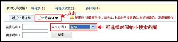 如需查询三个月前的交易,需选择“三个月前订单”选项进行查询,同时您可以在成交时间处选择交易时间缩小查找范围(见图二)。