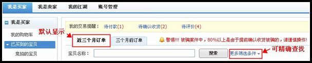 系统默认优先显示“近三个月的订单”,您可以点击“更多筛选条件”精确查找近三个月的购买记录(见图一)。