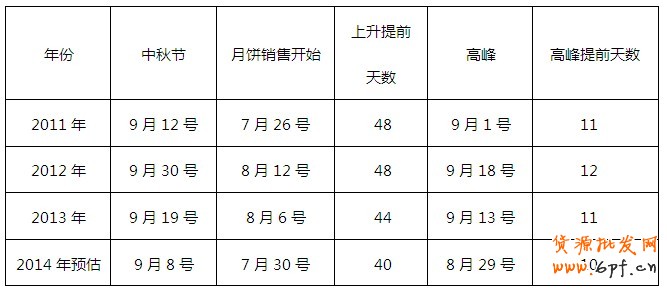 通过2011-2013市场趋势总结,销售周期逐年缩短,预估中秋节提前40天开始销售;每年销售高峰稳定在中秋节前10天,得出2014年市场预估,根据预估市场周期指定店铺的运营规划,实现精细化运营;