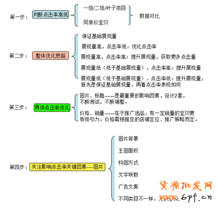 做好了引流,就需要谈论点击率,点击率公式为:点击率=点击量/展现量。怎样优化点击率,从公式可以看出,一是增加点击量,二是减少不必要的展现,下面一张图简单的概括了点击率优化的流程: