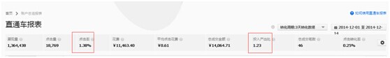 上图所截是直直通车12月初至1月初的14天对比数据,可以看出数据提升还是比较大的,花费增加的较小,流量增加较大,PPC从0.61下降到0.32,投入产出比从1.32上升至3.08。那么我们中间如何优化,通过对每个推广阶段具体分析下: