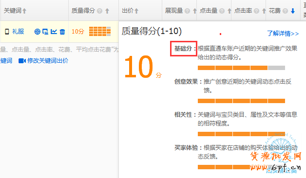 同个关键词在不同的宝贝里面有着不同的质量得分,可以看到10分的关键词带有着手机标志。关键词质量分反映宝贝数据的高低,同时也反映一个宝贝是否具备有潜力,我们都知道如果宝贝整体培养的数据很好,他所新添的关键词质量分就会高,这就跟关键词质量得分内的“基础分”和“创意分”有关,那么如何去提升影响到我们质量得分呢?最重要的数据是什么?