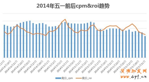 3) 长假过后pv、cpm和ROI都稳定回升,特别是cpm的上升的一个不可逆转的趋势;在4月25日-5月10日这半个月的“cpm凹槽(红框内)”是我们可以好好利用的时间。