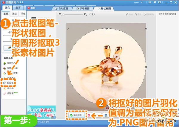 一、打开美图秀秀,打开三张素才,按照下图的步骤,点击抠图笔,选取圆形对素材勾选出一个圆形,然后对圆形中的图片 羽化这一项调为0,最后保存为png格式,第一张素材图就这样简单的完成了,剩下的两张按照同样的方法抠出来即可。