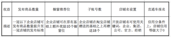 3.在商品发布数量,橱窗位,旺旺子帐号都有一定的权益,在店铺名选词上,我们也会开放:公司,企业,集团,官方,经销这五个词。在直通车报名上,也会降低企业店铺的信用等级限制。