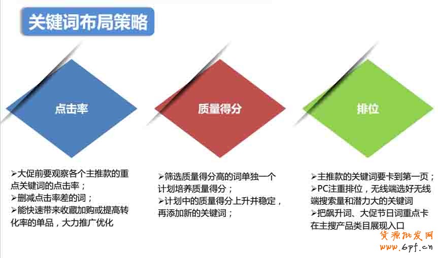 关键点:店铺分层;选款测试;制定大促推广方案;关键词布局策略;创意图策划设计;无线端优化。