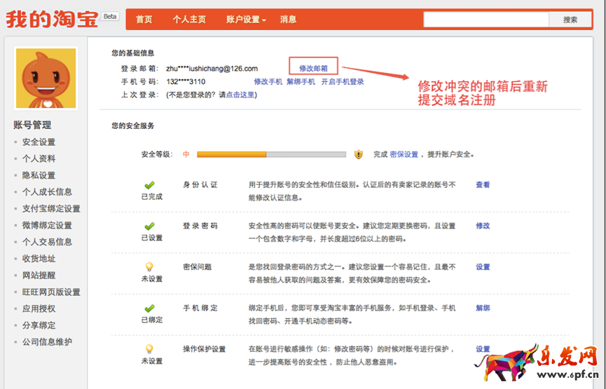解决方案:登录我的淘宝》账户设置,修改冲突的邮箱: