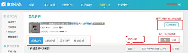 在我们做淘宝的时候,有的类目可能一个宝贝会有多个SKU,那宝贝有多个SKU详情页的顺序该如何去策划呢?假如说我们自己的宝贝有好几个颜色,我们要将卖的最好的颜色进行重点的描述,像卖的比较少的颜色我们就可以描述的少一点,甚至不描述。那么我们如何选择宝贝中卖的比较好的SKU呢,这里会用到一个工具,就是生意参谋。在专题工具里面,打开单品分析,在单品分析里面找到相对应的宝贝,然后进行销售分析。