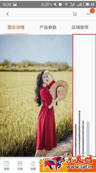 右上图这张图片看起来视觉还算是比较好的,但是还是有点浪费屏幕了,用红色框框起来的地方大家可以看到,本来这张图片是可以继续放大的,左边和右边或者上边都可以继续表达产品的信息,但是左右两边都没有充满,本来手机屏幕就比较小,现在又浪费了一点屏幕,所以这是绝对不允许的。