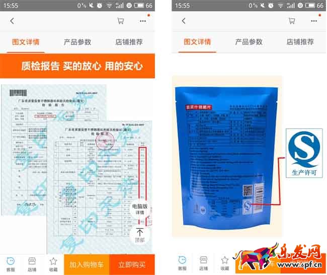 在pc端当中,把检测报告或者专利证书展现出来,这样的表达方式是很常见的。左下图中,图片可能是真实的,但是买家基本上是看不到资料上面的信息的,所以像这种证书类的应该怎样表达呢?右下图这张图片做的就比较好,把生产许可证直接引出来,如果说不引出来的话买家是不会注意这个的。在食品类目当中,QS认证是比较重要的购买理由,这也是促使买家下单的一个重要的购买理由,这样也会打消买家购买食品的顾虑。
