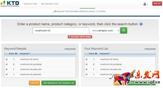 但是,Keyword Tool Dominator生成的亚马逊自动建议关键词,不像SEO Chat那样全面。同样键入“mushroom kit”只会生成4条结果,如下图所示。相比之下,SEO Chat是19条。