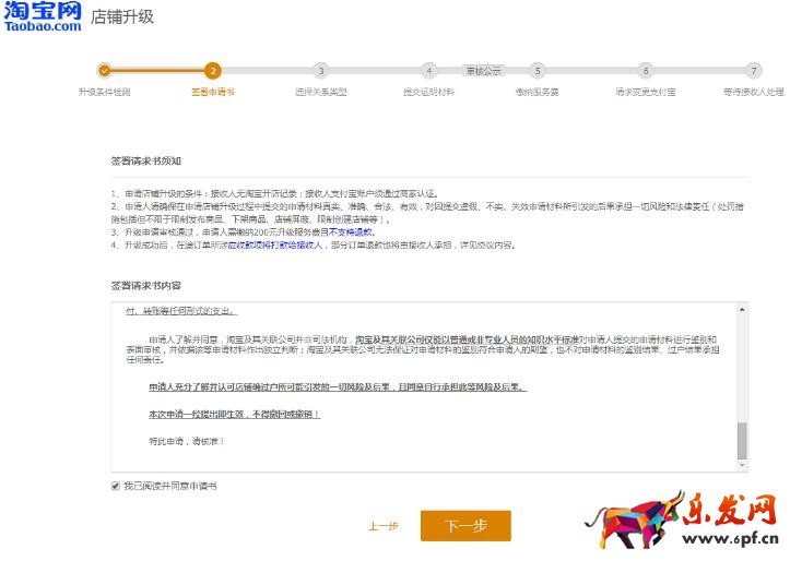 接下来签署申请书,然后下面会有一个签署请求书的须知,比如说申请人要在申请店铺升级的过程中提交申诉的材料要真实、准确、合法、有效,否则后果自负,并且审核过了还得叫200块升级服务费且不支持退款。还有签署请求书的内容,店长朋友要看看,然后点击勾选我已阅读并同意申请书。然后进入下一步。