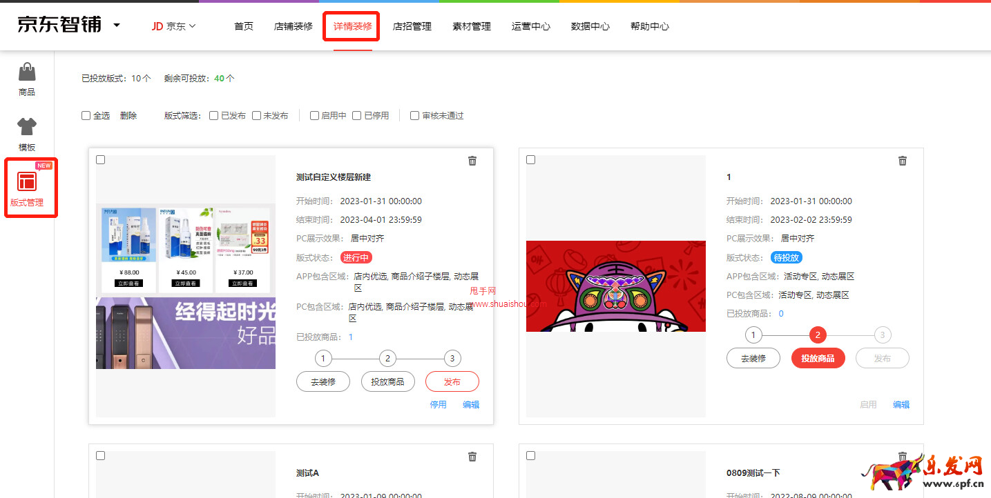 3、商家直接进入京东智铺创建关联版式。路径:详情装修—版式管理。