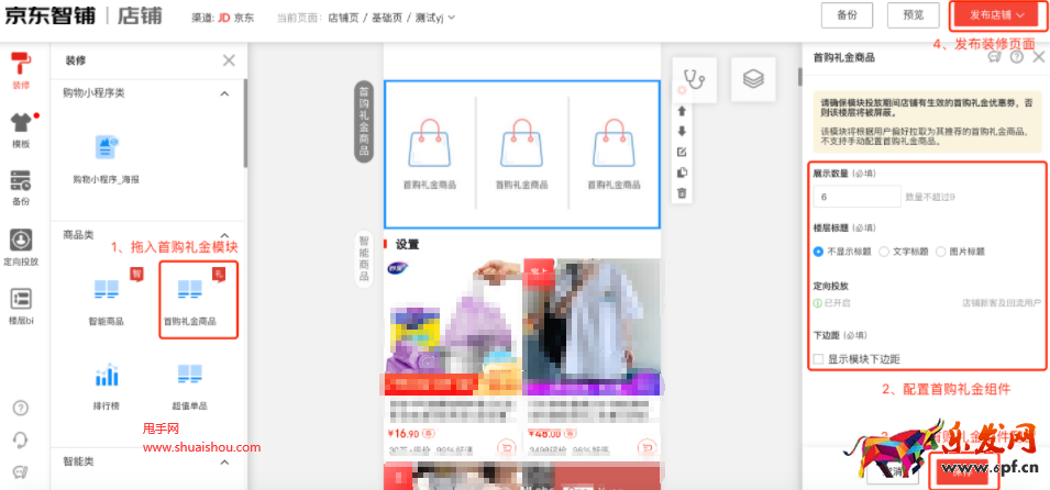 ②在装修区域,配置首购礼金组件内容,包括商品展示数量、楼层标题等;