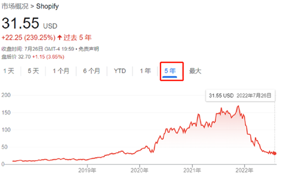 一系列的不利影响,导致Shopify业绩大受影响,股价也大幅度下跌,由2021年11月的175美元峰值,跌到现在的30多美元,跌去了80%。