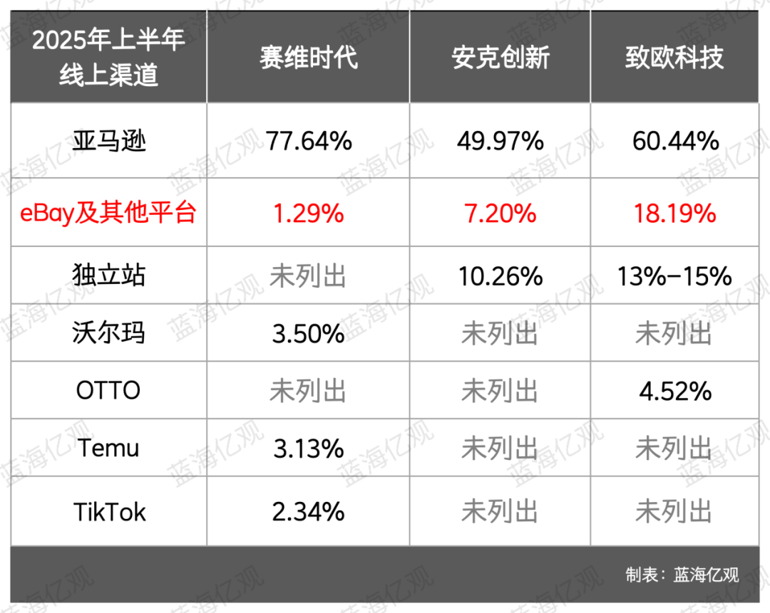 以赛维为例,2025年上半年,其来自亚马逊的收入占比为77.64%(约41.28亿元),而来自eBay与多个平台的收入则被列入“其他类”,总占比仅为1.29%。相比之下,Temu、TikTok等新兴平台给赛维贡献的收入占比超过了eBay,且在逐年上升。
