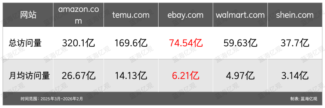 以eBay最大的站点美国站为例。近一年里,eBay总访问量约为74.54亿,虽然高于沃尔玛,但远低于亚马逊北美站(320.1亿)以及作为后来者的Temu(169.6亿)。其与SHEIN的差距,也正在缩小。(除了Temu,各平台均以美国站为考察对象)。