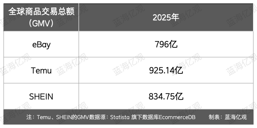 除了流量平稳,eBay的GMV也很平稳。2025年,eBay的GMV为796亿,已经被作为后来者的Temu、SHEIN赶上乃至超越。